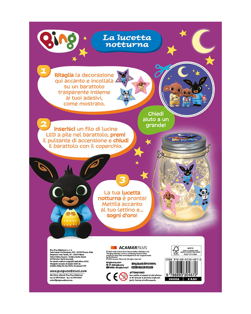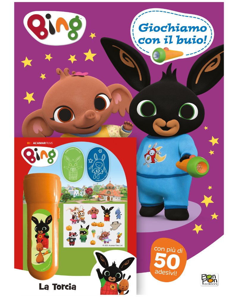 Divertiti insieme a Bing e ai suoi amici con i tanti giochi e i coloratissimi sticker! Imparerai che con il buio ci si può anche divertire, sopratutto con la torcia in regalo!