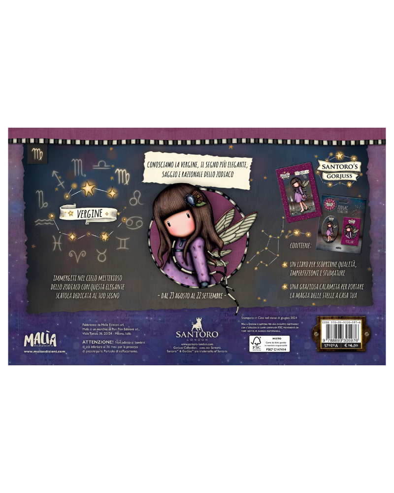 Un’incantevole Gift Box tutta dedicata al segno zodiacale della Vergine. Contiene due pezzi della Zodiac Collection firmata Santoro’s Gorjuss: la calamita con l’inconfondibile illustrazione del segno, per portare un pizzico di magia a casa o in ufficio, e un libro per scoprire misteri e meraviglie dello zodiaco. Una collezione poetica e originale, da regalarsi o regalare, per guardare al cielo stellato e farsi ispirare dalle ragazze Gorjuss. Dimensioni: 11,5x16 cm.