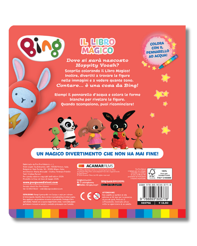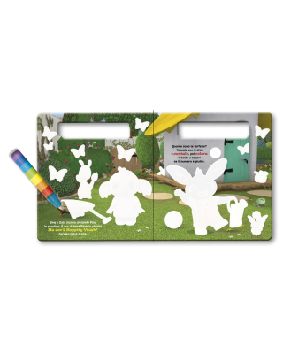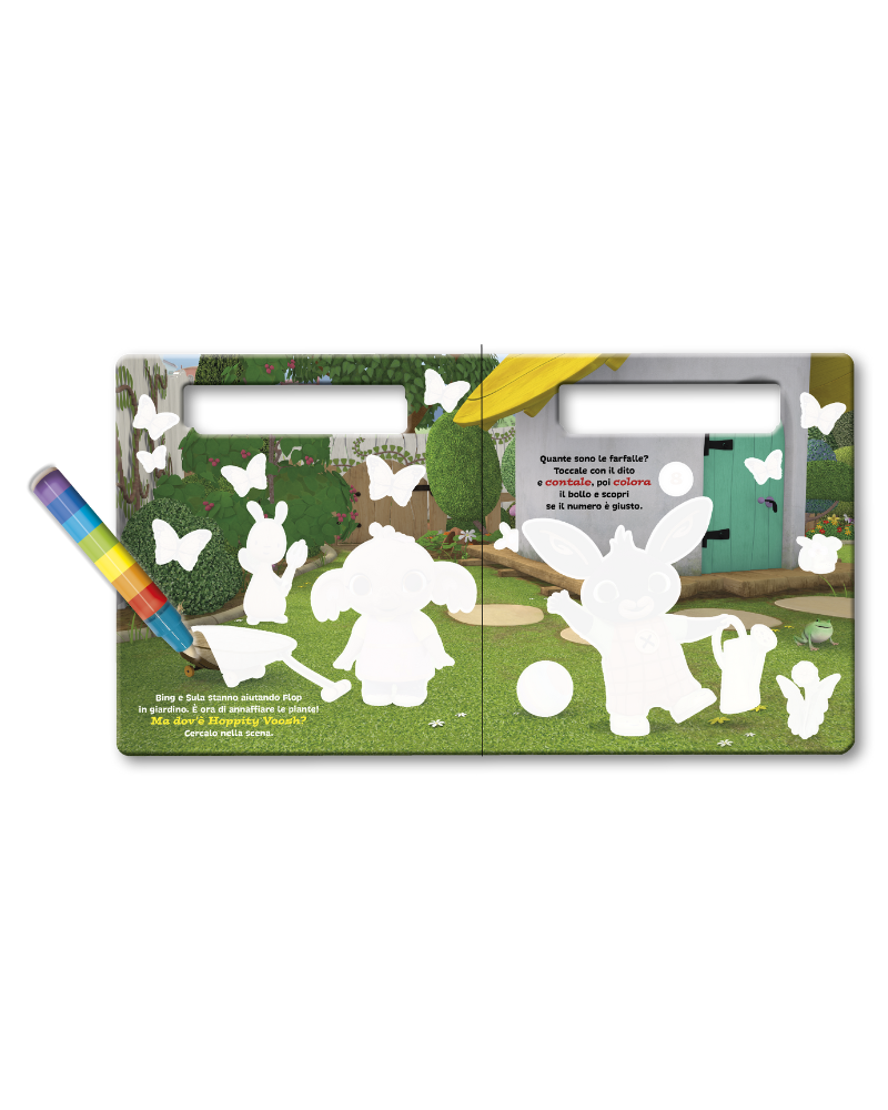 Dove si sarà nascosto Hoppity Voosh? Aiuta Bing a ritrovarlo! Poi divertiti a rivelare e contare tutte le figure nascoste in questo Libro Magico: ti basterà riempire il pennarello d’acqua e passarlo sopra le forme bianche per veder comparire i colori! E quando scompaiono… puoi ricominciare! Per un divertimento senza fine. Dimensioni: 23x25 cm.