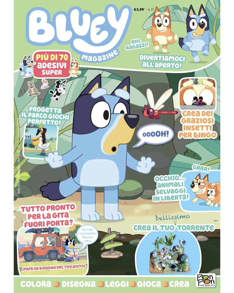 Arriva in edicola il magazine di Bluey, la serie fenomeno dell’anno: pagine da colorare, giochi, craft e sticker per stimolare la creatività e divertirsi insieme a Bluey, alla sua sorellina Bingo e alla loro famiglia. In regalo con la undicesima 2 Supergiochi!
