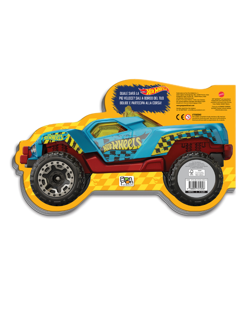 Un libro cartonato di grande formato, sagomato come una rombante Hot Wheels! Al suo interno piste sensazionali e bolidi scatenati, per emozionarsi immaginando salti e acrobazie a quattro ruote. Grandi gare per piccoli campioni! Dimensioni: 40x24 cm.