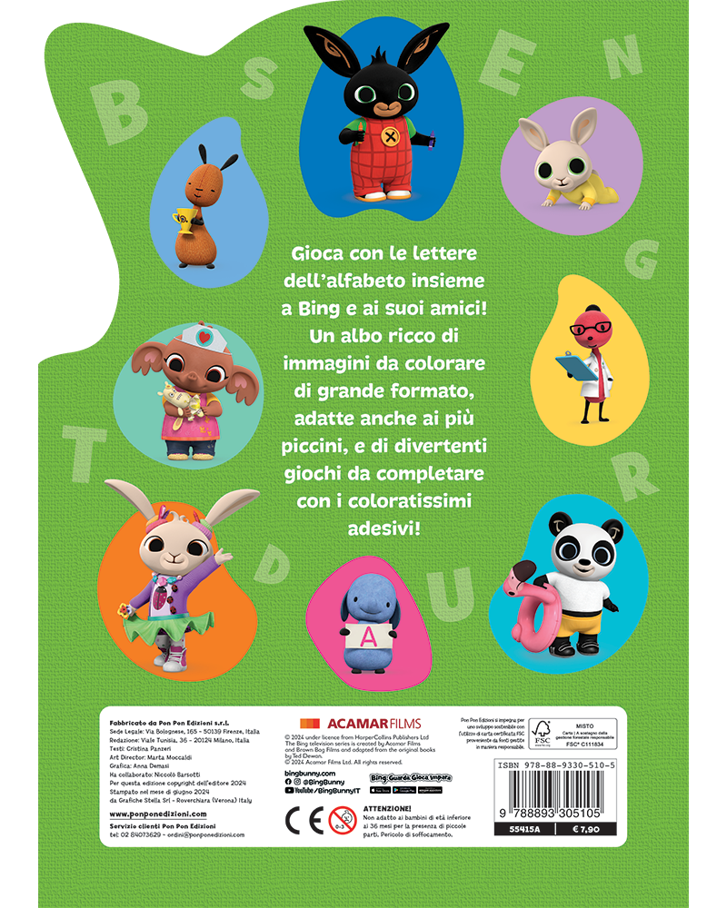 Divertiti a colorare e imparare l'alfabeto con i maxi disegni di BING e i suoi amici in un album speciale dal formato sagomato! Libera la tua creatività con tutti i colori! In regalo tanti adesivi da attaccare dove vuoi.