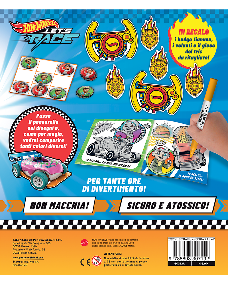 Preparati a gareggiare in compagnia dei tuoi piloti Hot Wheels preferiti! Colora le figure con il magico pennarello svelacolori, che è sicuro, atossico e non macchia. In regalo i badge fiamma, i volanti e il gioco del tris da ritagliare!